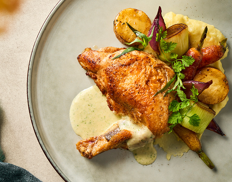 Parelhoenfilet 'fin champagne' | geconfijte aardappel | wintergroenten